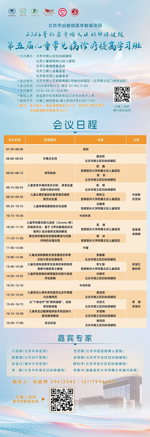 为提升各级医院儿科及相关专业医护人员对儿童常见病的诊疗水平,北京市顺义区妇幼保健院(北京儿童医院顺义妇儿医院)、北京儿童健康基金会、北京卫康公益基金会及北京新征程公益基金会联合主办的“北京市级继续医学教育项目——2026年第五届儿童常见病诊疗提高学习班”,将于2026年4月26日(本周日)在北京顺义召开。